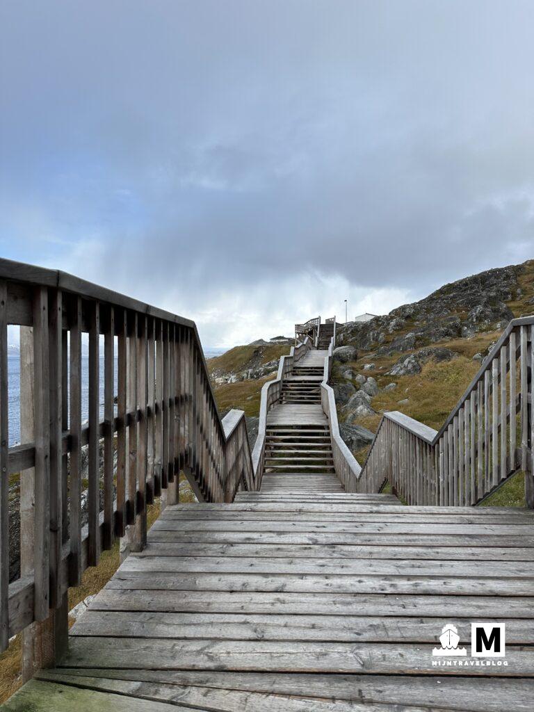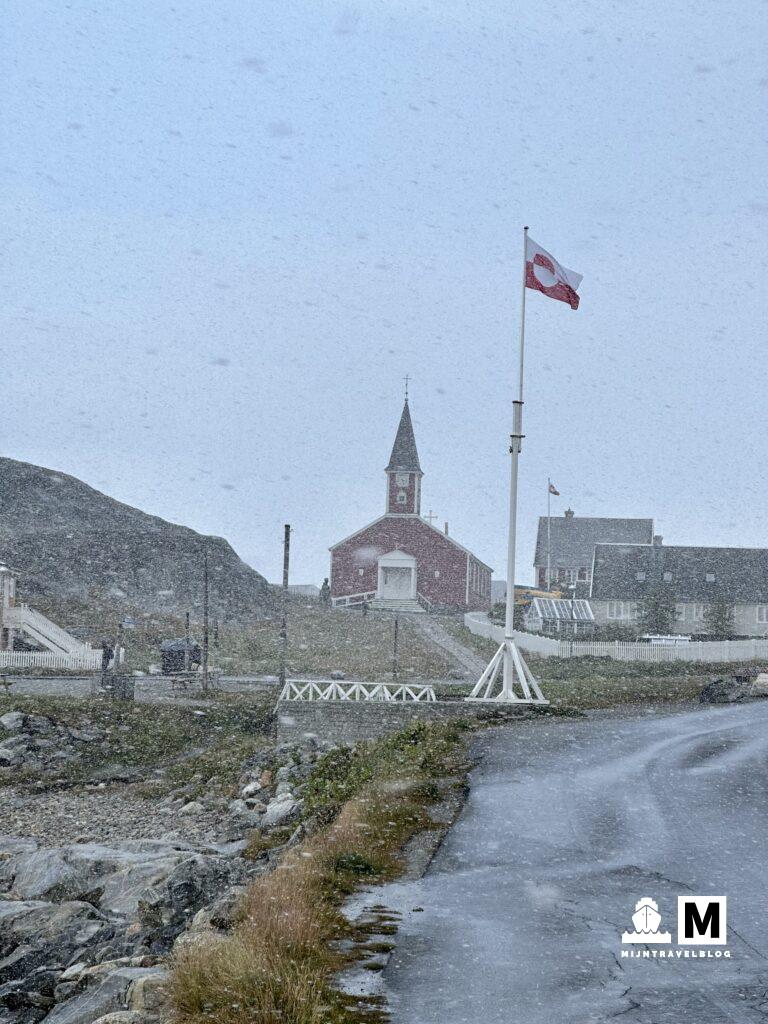 Het was best een hobbelende nacht. Wind en golven maar we slapen prima. Volgende stop is Nuuk: de hoofdstad van Groenland. Hier zijn we eerder geweest! Onderweg naar het ontbijt werd het ons al snel duidelijk dat het aanmeren wel een ding ging worden. Flinke wind en, wat later bleek, de eerste sneeuw van het winterseizoen. De kapitein loste dit goed op: in plaats van aan de kade gingen we ook hier in de tender. Niet ideaal maar met een uur vertraging konden de gasten toch van boord. De tenders brachten niet alleen ons aan land maar ook heel veel eten wat de rederij aan de lokale bevolking doneerde. Er groeit op Groenland bijna niets en alles is schreeuwend duur. Mooi voorbeeld van duurzaamheid. We zijn er bewust van de cruisen niet de meest duurzame vorm van reizen is maar op deze manier draagt het reizen bij aan het leven van de bevolking in gebieden waar het lastig overleven is. Niet alleen door geld van de gasten aan boord maar ook door eten te doneren. Mooi iets. Nuuk zelf kenden we al, maar nu met de sneeuw oogt het zo anders. We hebben een vijf kilometer gewandeld naar een plek waar we eerder waren. Toen lagen er in die baai nog ijsbergen en zwommen er mensen. Nu is de baai volledig vrij van ijs en sneeuwt het. Bijzonder hoe en stad dan twee gezichten heeft. Lunch in een lokaal tentje gedaan en weer naar het schip dat nog steeds niet aan de kade lag. Dit gebeurde pas laat in de avond zodat het schip kon tanken.