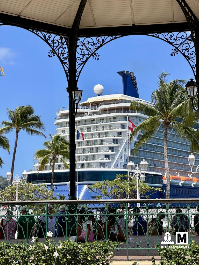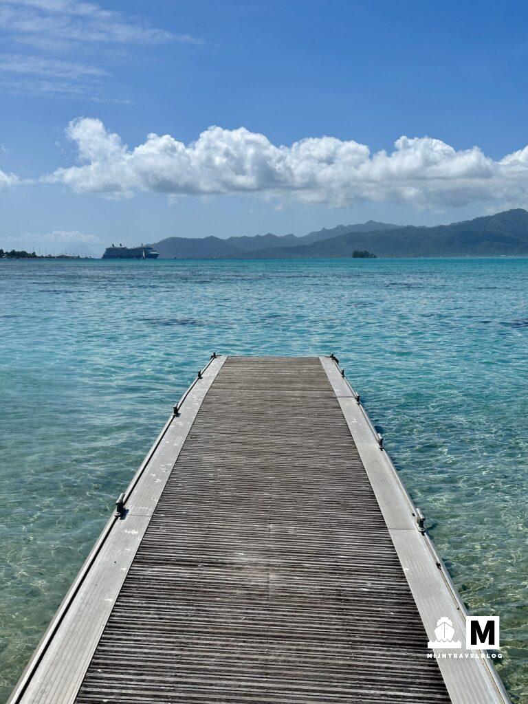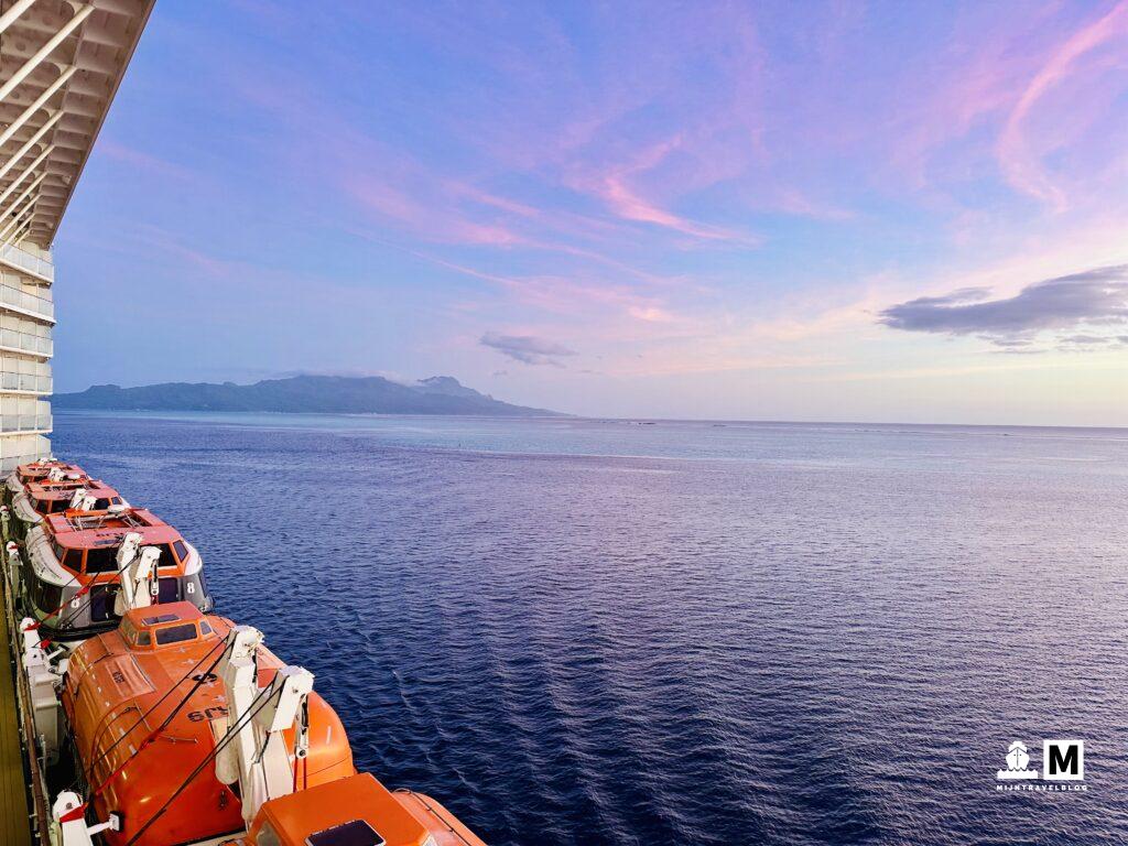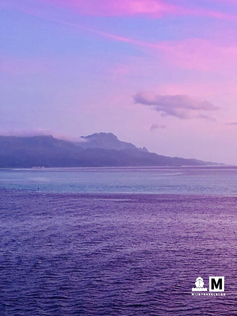 Het eerste eiland waar we stopten was Moorea. Hier hadden we van te voren dag passen voor het Sofitel geregeld. Supermooi hotel en echt het beeld wat je hebt bij een eiland dat 17.500 kilometer vanaf Nederland ligt. Moorea heeft geen pier. Met de tenderboot ga je van het schip naar het vaste land. Wel fijn dat we vaak met Celebrity zijn geweest want hoeven niet te wachten, via de VIP lounge mogen we de tender pakken wanneer wij willen. Hoeven geen tijd te reserveren of nummer te trekken. Het hotel ligt een 30 minuten met de taxi vanaf de haven maar helaas er was geen taxi die ons wilde rijden. Dubbele bieden van normale prijs hielp ook niet. Ze reden liever af en aan een 10 minuten rit naar het dichtstbijzijnde strand. Dat werd dus ook onze bestemming. We kwamen bij een heel smal strand. Niet zoals wij dat kennen. Voor de kust is een groot koraalrif dus het water is heel kalm en strak blauw. Na een stukje lopen kwamen we een rustig plekje tegen en hebben we de handdoeken neergelegd en de zee in gegaan. Weinig vissen maar een rog was wel snel gespot! Hoe leuk is het dan dat je familie in Nederland hebt die nog wakker zijn dus vanaf deze plek via FaceTime bijgepraat. Fijn! Vlakbij was een leuk restaurant voor een prima lunch. Taxi’s terug naar het schip waren snel gevonden. USD 5 pp per enkeltje is een prima deal. Heerlijke dag gehad voor minder kosten dat het hotel. Mooi toch. Zonsondergang is hier spectaculair. Allerlei kleuren blauw en paars.