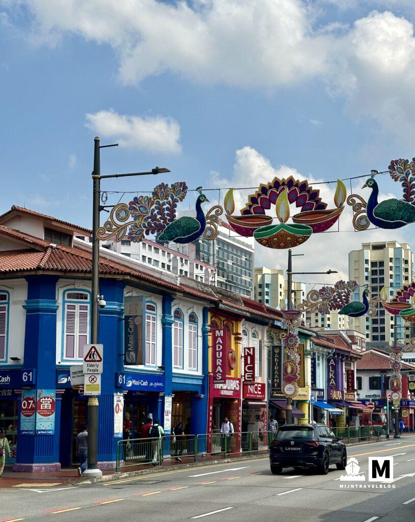 Zoals de naam van de wijk doet vermoeden is het de Indische buurt. Waar Singapore overal veel hoogbouw heeft zie je dat hier helemaal niet. Twee of drie lagen zijn de meeste gebouwen met kleurrijke gevels, overal muziek en wierook dampen. Naast ons hotel ligt één van de grootste markten van deze wijk. Eindeloze smalle gangen met eetkraampjes maar ook verse groente, vlees, vis en kip. We hebben al wel bedacht dat we hier niet gaan eten. Sorry we zijn niet heel avontuurlijk daarin. Los van het er niet willen eten is het wel heel tof om te zien en te ruiken. Voordeel van 1,97m lang zijn: je ziet en overziet alles. We zijn blij dat het hotel een zwembad heeft, want ongemerkt loop je hele afstanden in de brandende zon en de plak warmte. De dagen eindigden we dan ook vaak in het zwembad om daarna op zoek te gaan naar een leuk restaurant.