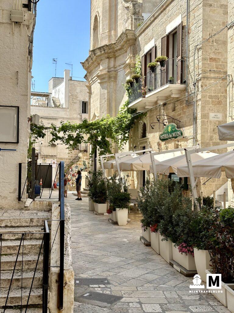 Onbegrijpelijk hoe mensen hier al eeuwen wonen. Bovenop het hoogste punt staat de kathedraal. Online zag die er prachtig uit dus een kaartje gekocht en naar binnen gegaan. Veel kerken gezien maar dit was wellicht de meest indrukwekkende. Zeker het bezoeken waard. Wat ons ook opviel: ondanks dat het best toeristisch is vrij normale prijzen qua eten en drinken. Je wordt niet meteen afgezet. Natuurlijk ook hier een lunch gedaan en wat smaakt alles toch lekker hier. Wij noemen in Nederland sommige dingen Italiaans maar we maken het gewoon niet met de juiste ingrediënten. Wat een verschil en met name de eenvoud van de maaltijden. Heerlijk! Op het moment van lunchen hadden we de 10.000 stappen aangetikt. We wilden heel graag nog één ander dorpje bezoeken: Polignano a Mare.