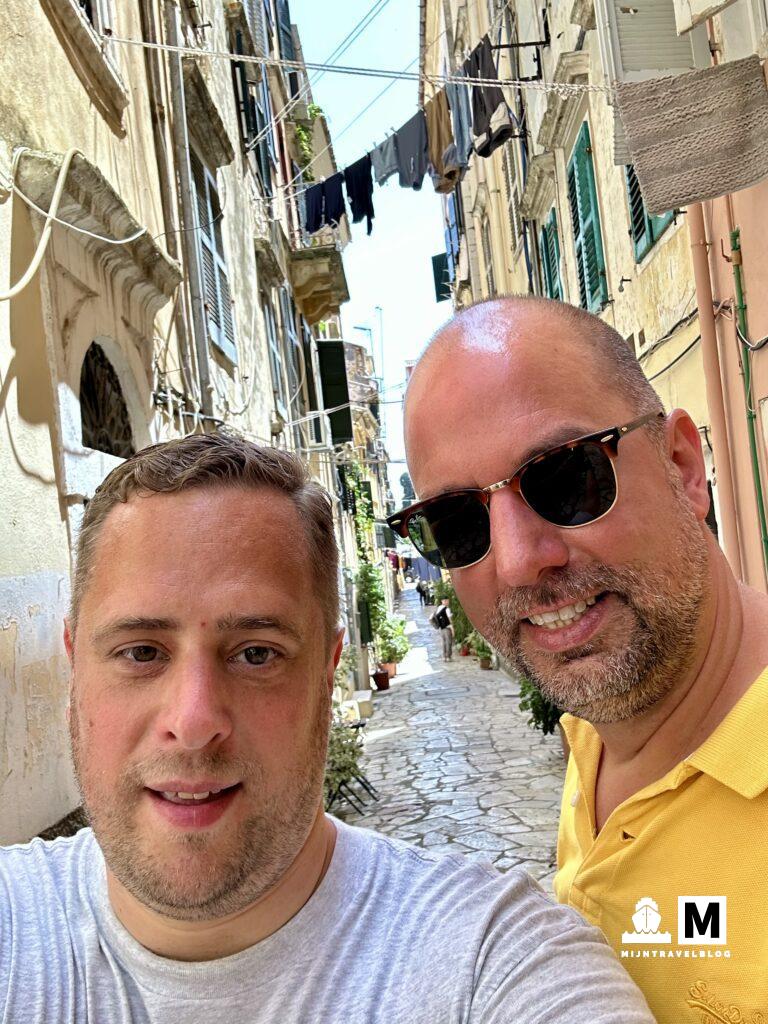 Eigenlijk ligt het schip echt heel goed qua locatie voor een bezoek aan de oude stad van Corfu. Er rijden shuttle bussen van en naar de cruise terminal en ook lopend is het best te doen. Dit laatste deden wij en met een 2,5 km lopen langs de kust loop je de oude stad in. Het was goed warm, tikte bijna 30 graden aan, dus als eerste een terras opgezocht en wat verkoeling in de vorm van en colaatje. Op het terras is het grappig te ervaren dat er meerdere schepen aan de kade liggen. Je kunt bijna zo zeggen wie op welk schip zit. Rederijen pakken heel goed hun eigen segment. Waar we wel aan moeten wennen de afgelopen dagen: het gerook op terrassen. Wat wen je snel aan het redelijk rookvrije Nederland. Na het terras zijn we de stad gaan verkennen. Ook dit was weer erg leuk. Al die smalle straten en wat ons op viel: de lokale bevolking komt ook nog in de binnenstad. Het is niet alleen toeristen wat er rondloopt. Ook hier ruimschoots de 10.000 stappen gehaald dus konden we wel een lunch gebruiken. Tijdens het dwalen waren we in een klein straatje een tentje tegengekomen en wonder boven wonder vonden we die ook nu weer terug. Een prima lunch met vriendelijk personeel en niet op een mega toeristische plek. Daar houden we van. Het weer is omgeslagen van rond de twintig en nat naar blauwe luchten en 30 graden of meer. Bij het dwalen door de oude stad merk je dat niet zo maar op de weg terug naar het schip was het echt wel warm. Wie loopt er ook tegen 15.30 uur in de zon voor meer dan half een uur.