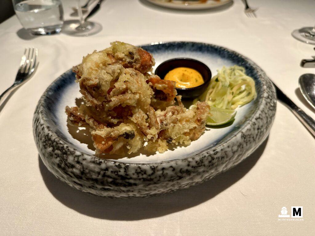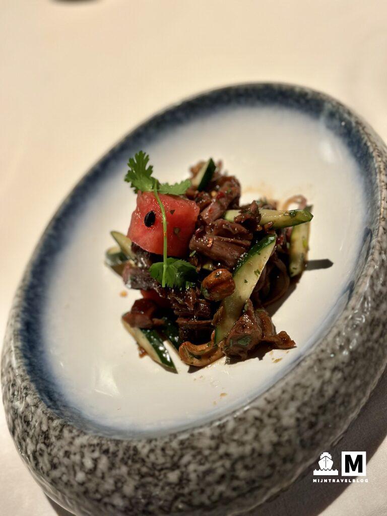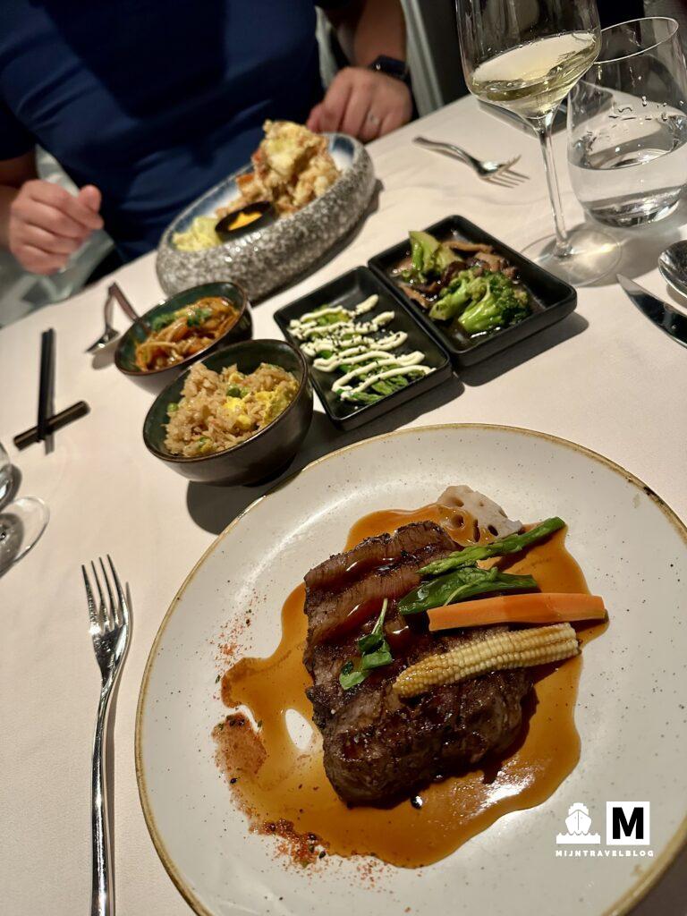 Na het zwemmen een douche genomen en langs onze favoriete bar gegaan (Founders). Beetje gelijk qua drank keuze als bijvoorbeeld de World Class bar bij Celebrity Cruises. Zeg maar de betere cocktails. Heerlijk! Aan boord van de Oceania Vista zijn vier specialiteiten restaurants en vanavond hebben we Red Ginger gereserveerd. Dit is een Pan Aziatisch restaurant en zeker het beste qua eten wat we aan boord hebben gehad. Een heerlijke afsluiting van een erg verrassende cruise voor ons. Mooie bestemmingen en een heerlijk schip. Wat wil je nog meer.
