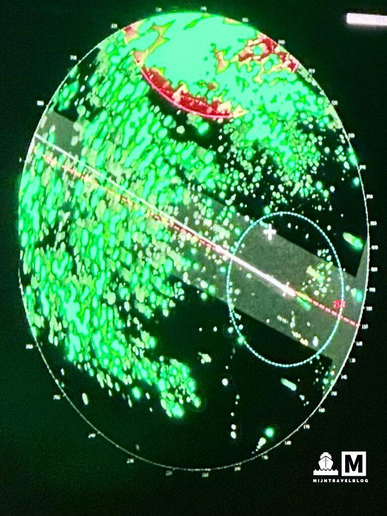 Het Skjoldungen fjord was al adembenemend mooi en dan vraag je je al snel af of het nog beter kan worden. Eerste idee was nee. Het weer sloeg bij het wegvaren goed om: mist, regen en ook de deining werd erger. Elke dag is er voor het eten een briefing voor de daarop volgende dag. De expeditieleider neemt je mee in wat we gaan doen en hoe het praktisch gaat lopen. Terwijl hij de presentatie hield werd het weer slechter en slechter. Gaat dat goed komen. Het weerpraatje is ook vast onderdeel van zijn verhaal en het weer ziet er goed uit voor morgen. Twee mooie landings gaan we maken. Wel weer vroeg op maar dat weet je bij een cruise als deze. Na de presentatie weer lekker gegeten en nog een laatste borrel in de lounge. Liggen er rond 22.30 uur in en slapen vlot zo op de deining van de zee. Nog voor de wekker gaat horen we Michael, de expeditieleider, over de speakers. Begint gewoonte te worden met zijn stem wakker worden. Helaas geen goed nieuws. Het weer is slechter en slechter geworden en vandaag wordt het een dag op zee. Het is niet veilig om aan land te gaan. Veel ijs op zee en dat in combinatie met de mist maakt het onmogelijk. Later op de dag liet hij ook een radar beeld zien (zie de afbeelding hieronder) en de witte/rode lijn was de geplande koers en de groene stippen zijn ijsbergen. Met helder weer al mission impossible om doorheen te komen, laat staan met mist.