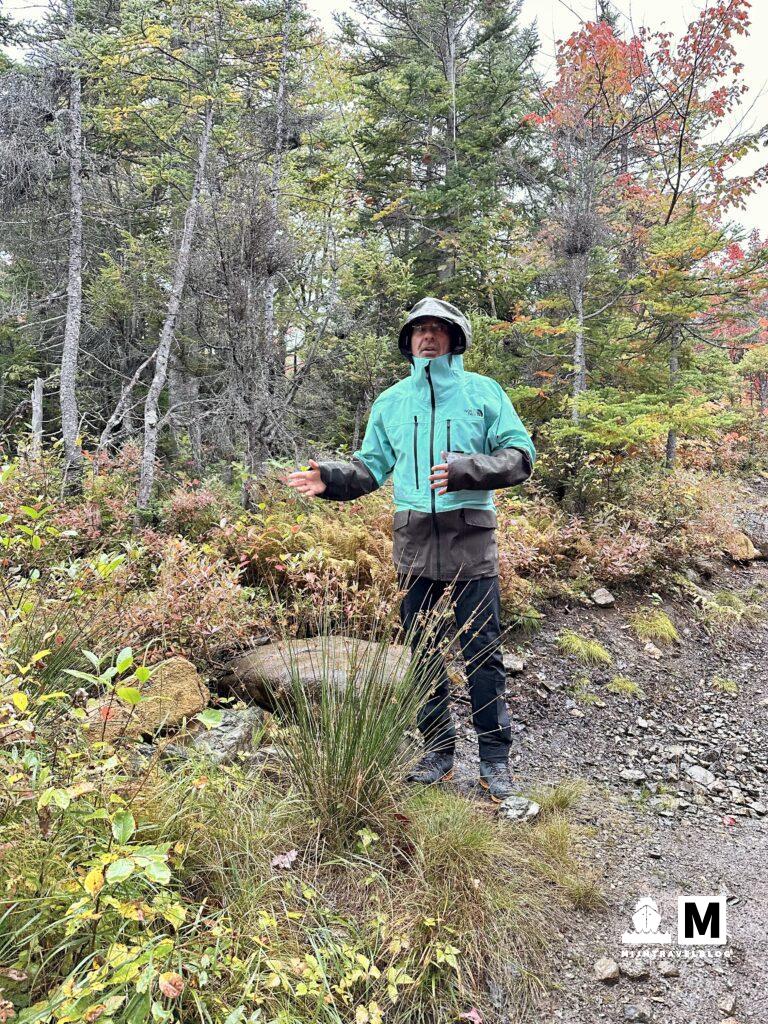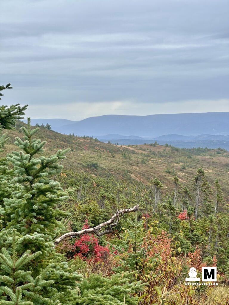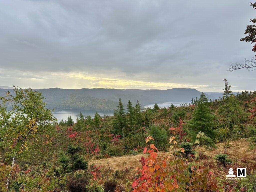 In de nacht vaarde het schip door naar Woody Point. Bij het wakker worden was het grauw en bewolkt en ook niet helemaal droog. Woody Point ligt in een baai en bij het binnen varen daarvan werden we heel het stuk begeleid door een groep dolfijnen. Leuk begin van de dag. Cruisen heeft voor en nadelen. Nadeel is je bent vaak ergens maar één dag en ook met slecht weer onderneem je dan dingen. Dat is dan tevens ook meteen het voordeel. Als je ergens langer bent denk je wellicht: laat maar zitten vandaag maar nu heb je geen keuze. Wij hadden namelijk gekozen voor een hike de berg op. Drie kilometer omhoog en drie kilometer naar beneden. De heuvel zelf was circa 350 meter hoog. Na het ontbijt gingen we als eerste van boord. De zodiac bracht ons vlot aan land. De regen werd wat heftiger maar we gingen toch want de bergen zagen er zo mooi uit met de herfstkleuren. Bij de kade stond een oude schoolbus te wachten die ons naar het beging van de trail bracht en waar teven het bezoekerscentrum van Gros Morne National Park is.